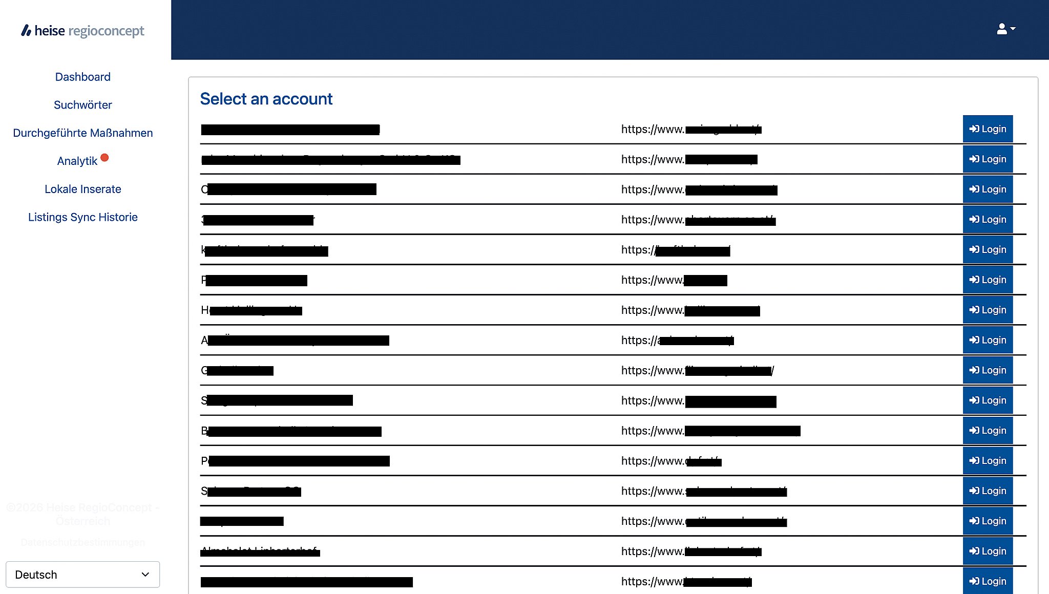 Am 18.4.2026 machte ich von einem meiner Kunden, der (noch) einen SEO-Vertrag bei Heise regioconcept hat, das SEO-Kunden-Dashboard bei Heise regioconcept auf und stellte fest, dass dort auf einmal sehr viele andere Kunden-Logins zugängig sind - zumindest mit dem von Heise erhaltenen Dashboard-Link meines Kunden.